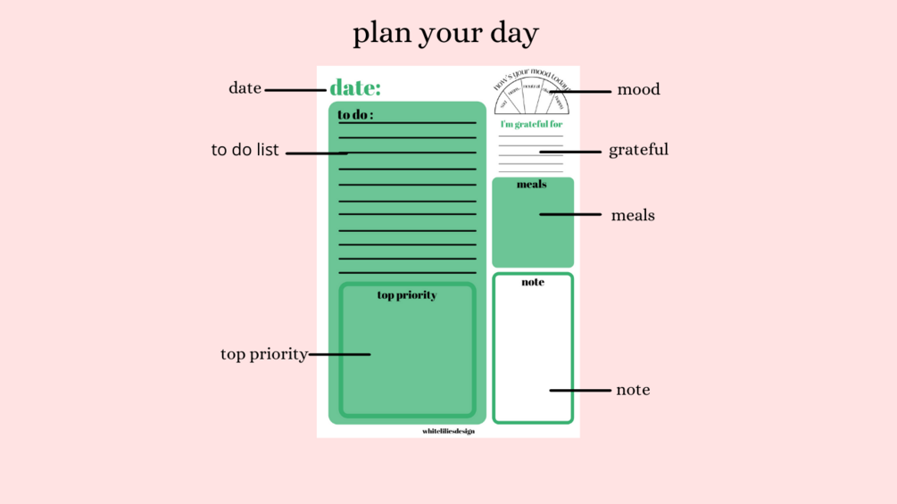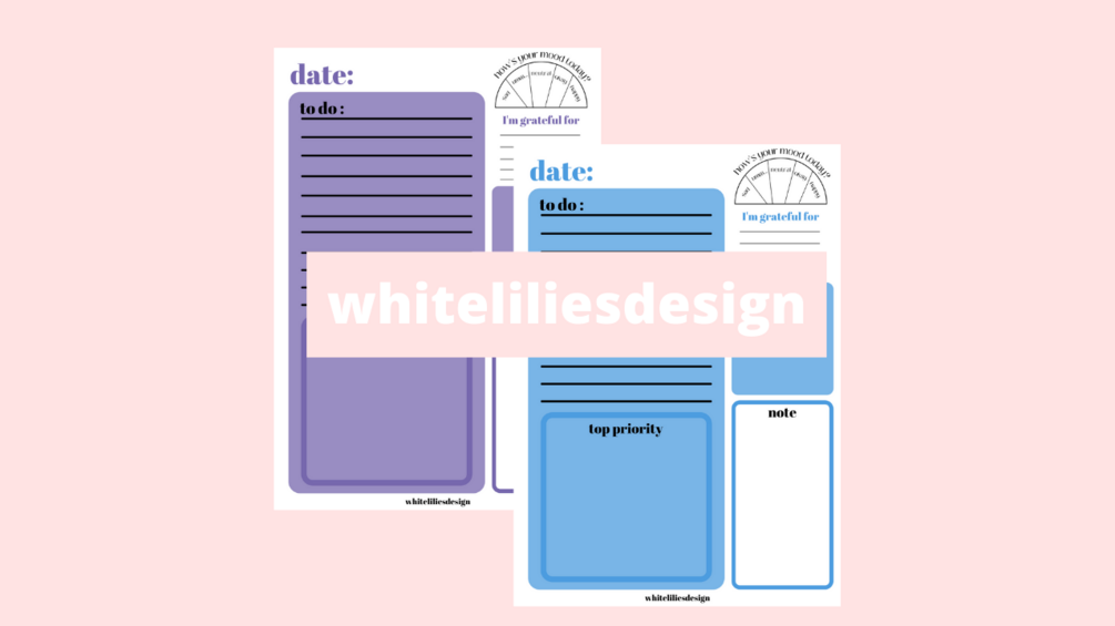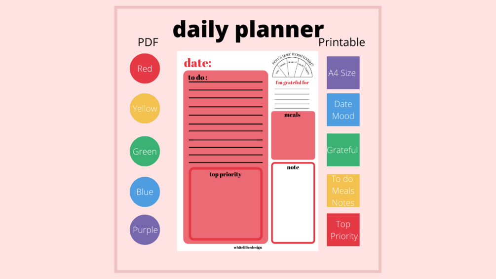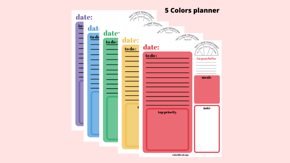 this is a 5-colored daily planner which includes, date, to-do lists, a top priority box, mood meter, gratitude entry, meals planner, and notes. this whole package comes in 5 different colors, Red, Yellow, Green, Blue, and Purple. hope you like it...